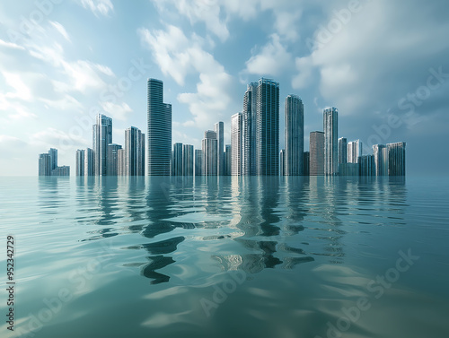 © TS Armin, Fototapeta premium Skyscrapers Reflected in Calm Water Cityscape Urban Landscape Architecture Sea Ocean Buildings Reflection Blue Sky Clouds