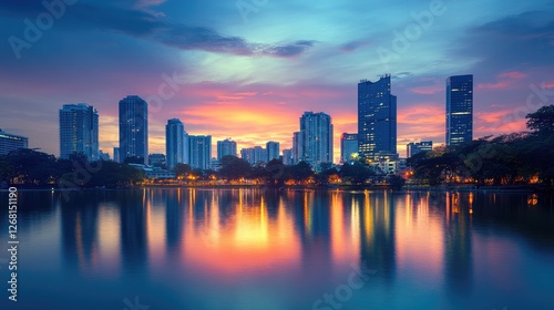 © Ketua, Fototapeta premium Skyscrapers Reflecting in a Calm Lake at Sunset