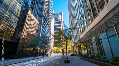 © Anak, Obraz premium Skyscrapers rise above the urban street with their glass and steel facades