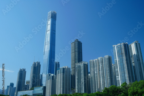 © song, Naklejka premium Skyscrapers Viewed from Below with Blue Sky and White Clouds