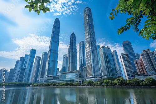 © song, Obraz premium Skyscrapers Viewed from Below with Blue Sky and White Clouds