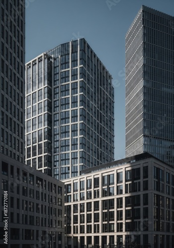 Fototapeta premium Skyscrapers with Reflected Windows Against Clear Blue Sky