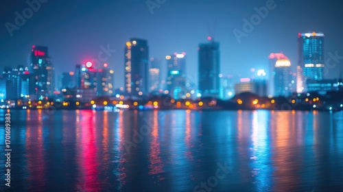 © SUPHAKPHEN, Fototapeta premium Skyscrapers, with views of twilight light from the sky, evening, blurred background.