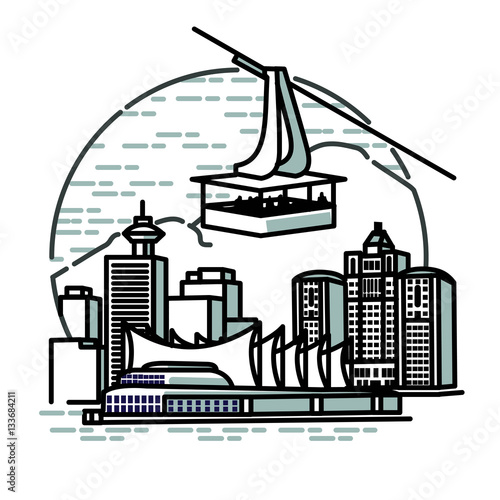 Obraz premium Skytram hovers over a circular vancouver city with buildings the pacific...