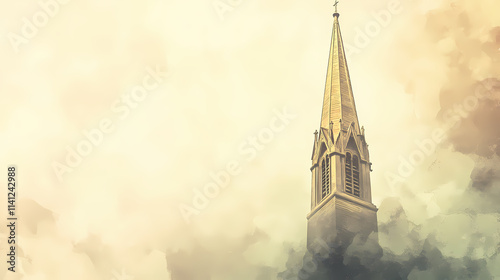 Fototapeta premium Skyward church spire biblical illustration christian aspiration and faith beige background copyspace. Spire. Illustration