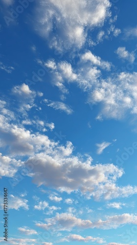 Naklejka premium Skyward Serenity: An awe-inspiring aerial perspective of a captivating, bright blue sky is adorned with fluffy clouds, invoking a sense of tranquility and limitless possibility.