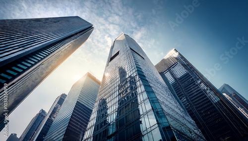 © MRSUTIN, Obraz premium Skyward View of Modern Skyscrapers Against a Blue Sky