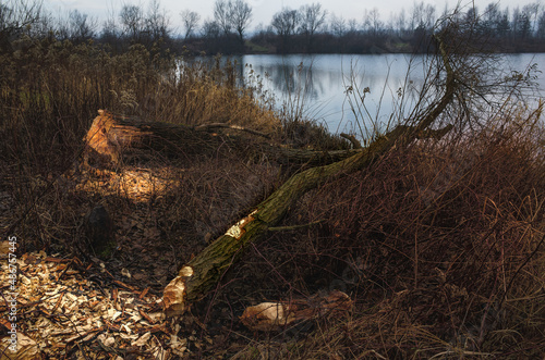 Fototapeta premium Ślady bobrów nad jeziorem