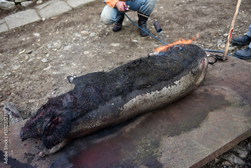 Obraz premium Slaughter burn the pig hair off with a gas burner