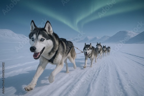 Naklejka premium Sled Dogs Pulling a Sled Across the Snowy Landscape Under the Aurora Borealis, Conveying Adventure