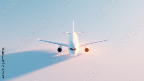 © Andrei, Obraz premium Sleek airplane soaring through pastel skies, casting soft shadow