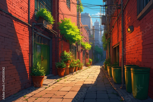Fototapeta premium Sleek alley with bright yellow reflections, black-framed glowing windows, green pots along red and white walls, in anime style
