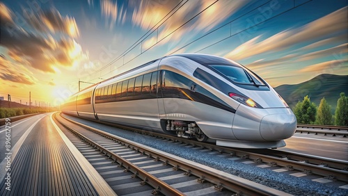 Naklejka premium Sleek and aerodynamic modern high-speed train traveling on tracks,...