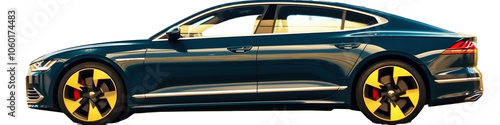 © Pixel Crafters PNG, Fototapeta premium Sleek and stylish black sedan with unique yellow wheels in an urban setting.