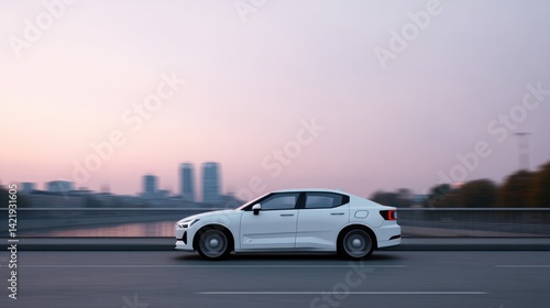 Fototapeta premium sleek autonomous electric vehicle navigating futuristic urban street at twilight