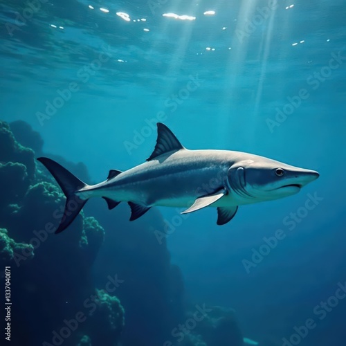 Fototapeta premium Sleek barracuda swims in vibrant blue ocean water , shadow, sharp