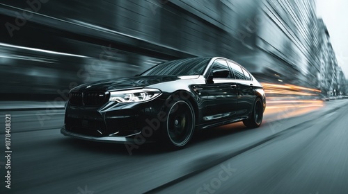 © ffunn, Fototapeta premium Sleek black car in motion captured with motion blur, driving fast along a multilane city road with dramatic lighting.