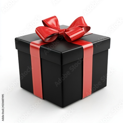 Obraz premium Sleek black gift box with shiny red ribbon and bow on a white background
