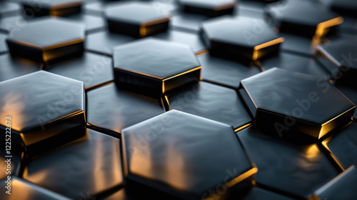 © buraratn, Obraz premium Sleek black hexagonal tiles with glossy finish, reflecting light beautifully. modern design creates striking visual effect, perfect for contemporary backgrounds