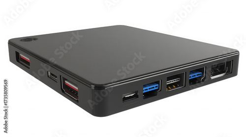 Fototapeta premium Sleek black mini pc featuring multiple ports for connectivity on transparent...