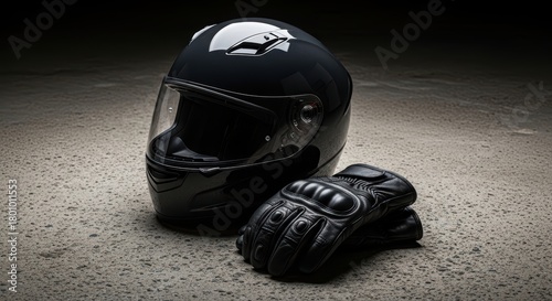 Naklejka premium Sleek black motorcycle helmet and leather gloves on concrete surface