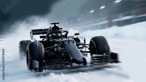 © Nora, Obraz premium Sleek black race car at high speed on a snowy track