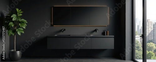 Obraz premium Sleek black vanity, dark matte walls, modern fixtures, tile, spa-like, interior