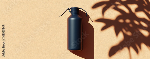 Fototapeta premium sleek black water bottle casting shadow on textured orange wall, showcasing...