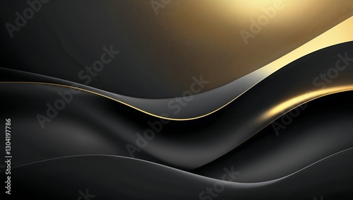 © Waris, Obraz premium Sleek Black Waves with Golden Light and Smooth Curves Creating a Futuristic Abstract Landscape