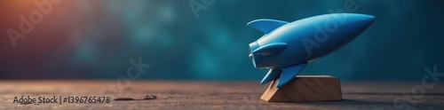 Fototapeta premium Sleek blue rocket, wooden stand; represents innovative technology , wooden, startup