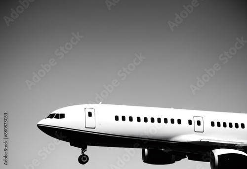 © ipolstock, Fototapeta premium Sleek commercial jet airplane in black and white. For aviation industry presentations, travel agency promotions, or transportation-themed designs.