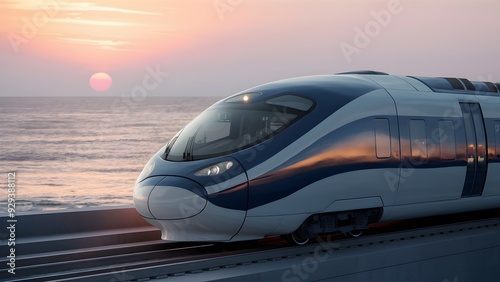 © NovaNicheTee, Obraz premium Sleek Commuter Train Coasting along the coastline