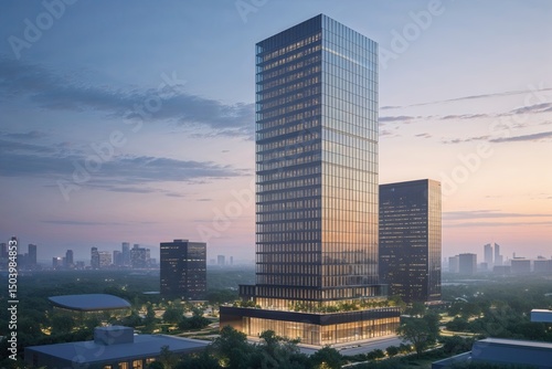 Obraz premium Sleek Corporate Architecture Bathed in Soft Morning Light Over Serene Cityscape