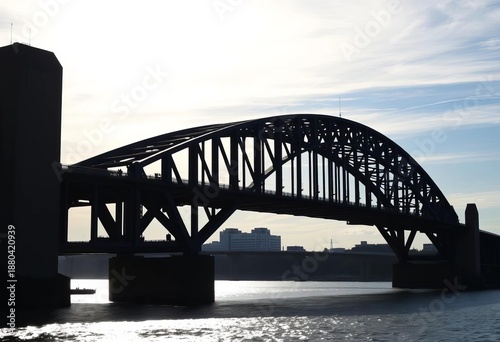 Fototapeta premium Sleek, dark bridge silhouette against bright sky, artwork, element