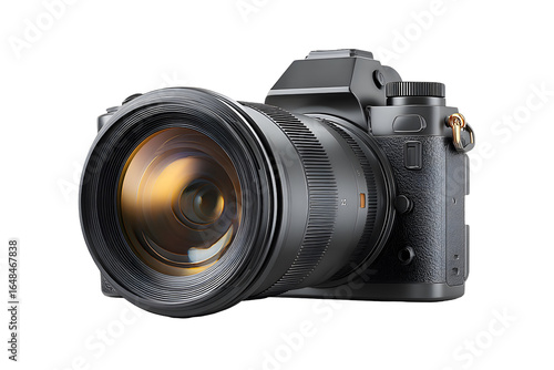 Fototapeta premium Sleek digital camera with lens on a transparent backdrop emphasizing...