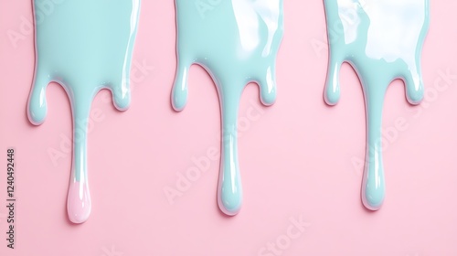 © Tackey, Naklejka premium Sleek Drips of Light Blue Paint on Soft Pink Background Creating a Vibrant and Artistic Visual Effect