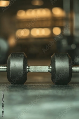 © Anton, Naklejka premium Sleek dumbbell rests on gym floor, capturing focus with blurred