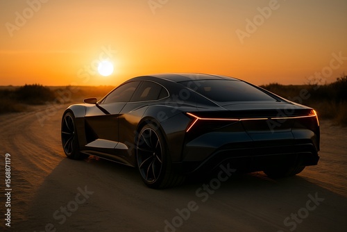 © Suplab_Designer, Fototapeta premium Sleek Electric Car on Desert Road at Sunset with Modern Tail Lights