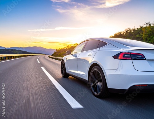 Fototapeta premium Sleek Electric Car Speeding on Highway at Dusk – Dynamic Motion Blur...