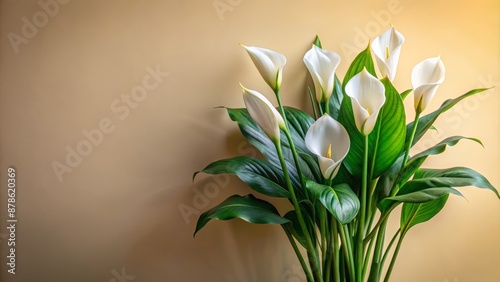 © Chaiyaporn, Naklejka premium Sleek, elegant peace lilies arranged artfully on a simplistic, bright background, providing ample space for text or design overlay.