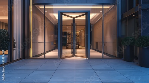 © Aeman, Obraz premium Sleek entrance with a frameless pivoting door and a hidden smart lock system