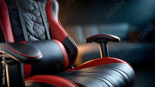 © Picgaxel, Obraz premium Sleek, ergonomic gaming chair with black and red design, featuring adjustable armrests and quilted backrest, perfect for enhancing comfort during long gaming sessions