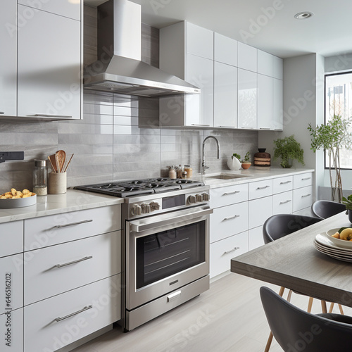 Fototapeta premium Sleek furnished kitchen, stylish Beautiful cooking area, interior design