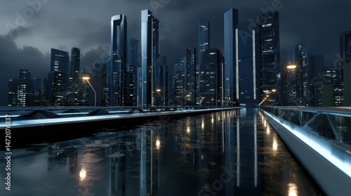 © KAMOLPOP, Naklejka premium Sleek Futuristic Cityscape with Towering Glass Architecture Under Night Sky
