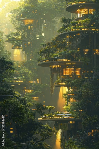 Naklejka premium Sleek glass buildings harmonizing with greenery in a vibrant solarpunk city