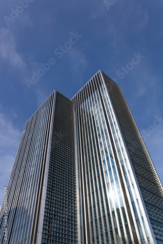 Obraz premium Sleek Glass Skyscraper, Low Angle View