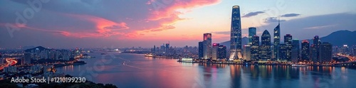 © meenmeen, Fototapeta premium Sleek glass skyscraper reflecting city skyline, gray, reflection, modern