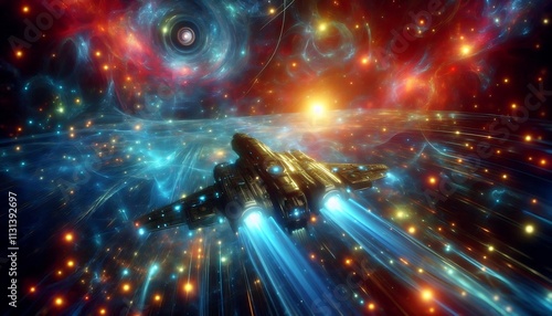 Fototapeta premium sleek glowing futuristic spacecraft navigating through dynamic space debris under vibrant celestial light