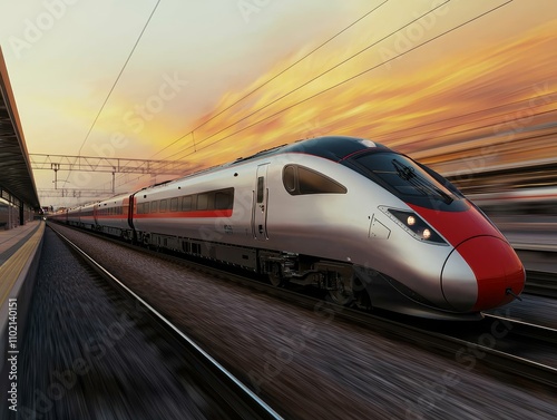 © Kittipong, Naklejka premium Sleek High-Speed Train Racing Under Sunset Sky - Modern Transportation Technology Concept