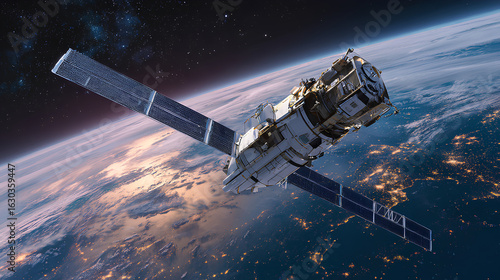 Obraz premium Sleek High-Tech Artificial Satellite Orbiting Earth Amid Twinkling Stars...